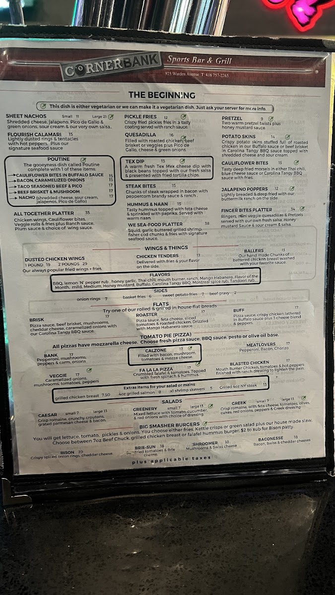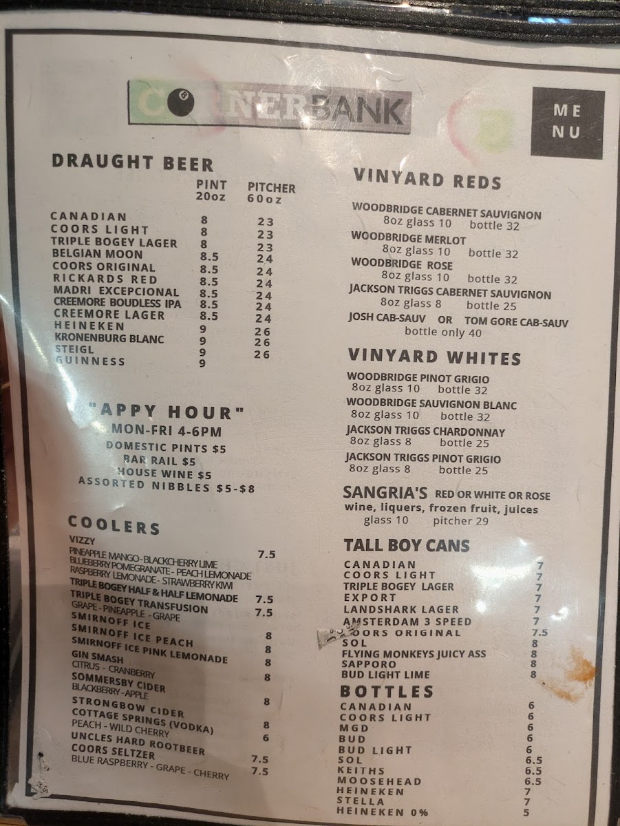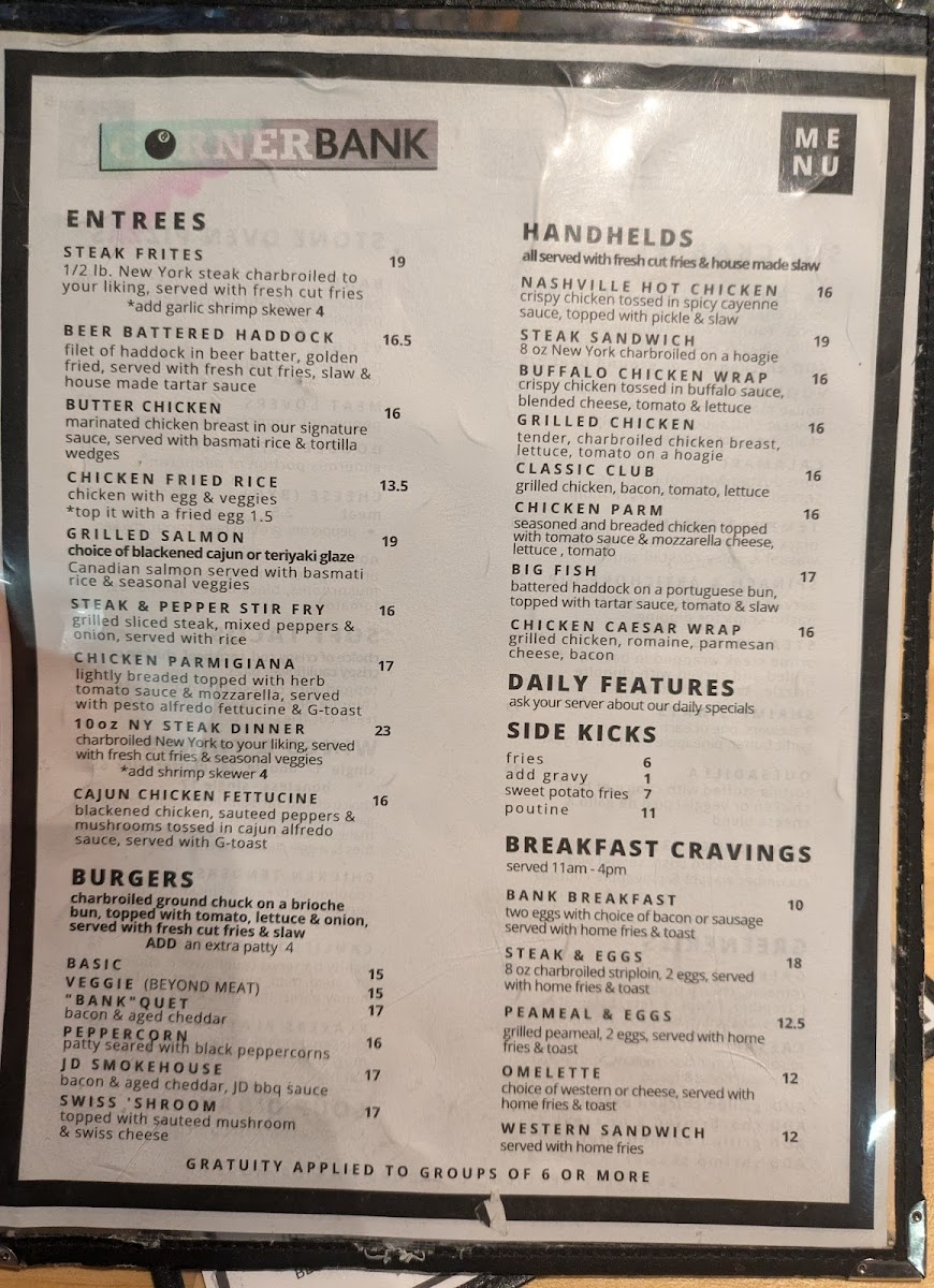 The Corner Bank Sports Bar & Grill offers a menu that complements its lively yet relaxed atmosphere, focusing on casual bites and comforting drinks ideal for any game day or casual night out. Whether you're settling in for a pool match or catching the big game on one of the many TVs, the menu provides a variety of satisfying options that suit different cravings and occasions.